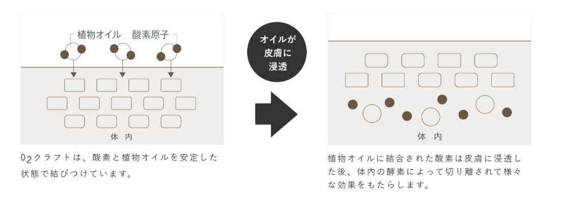 高濃度に酸素を含有したオイルは、皮膚に塗布することで、植物オイルは経皮吸収され、結合された酸素は体内の酵素によって切り離されて様々な効果をもたらします。
