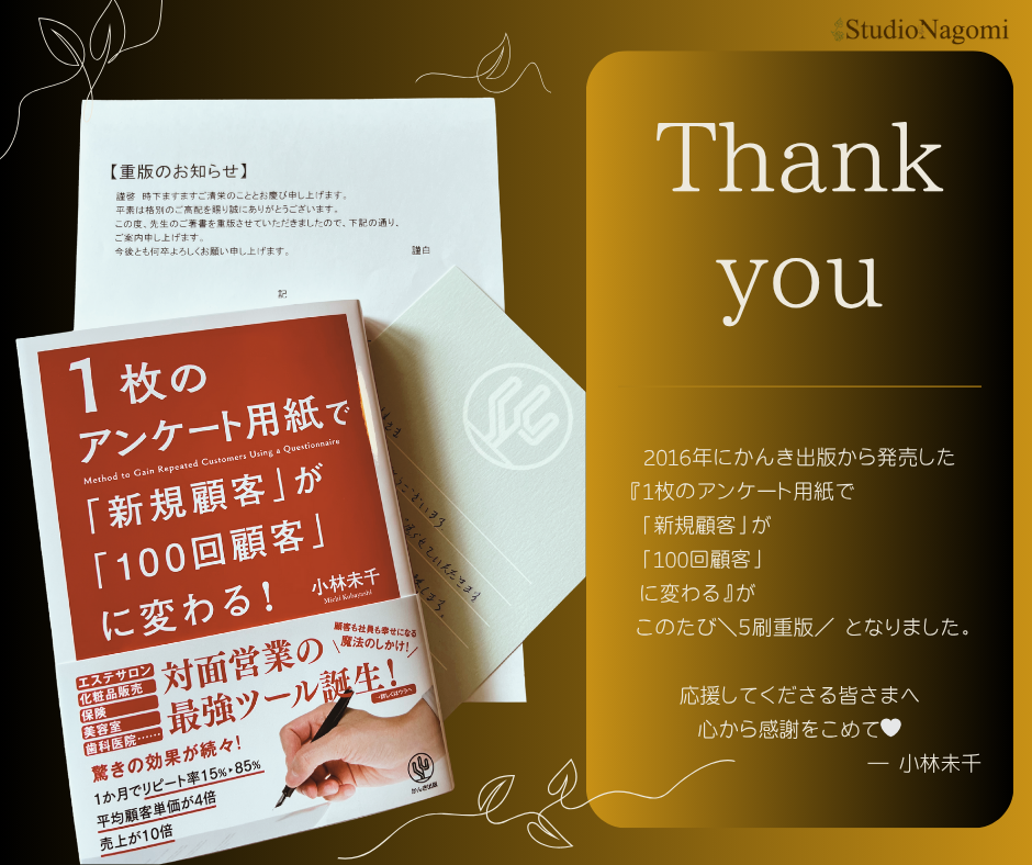 『1枚のアンケート用紙で新規顧客が100回顧客に変わる』(かんき出版)5刷重版!